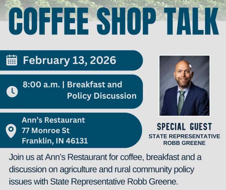 Members of Indiana Soybean Alliance and Indiana Corn Growers Association are invited to the Coffee Shop Talk with State Representative Greene on February 13. Please join us at Ann’s Restaurant in Franklin, IN at 8:00 a.m. ET for coffee, breakfast and a discussion on ag policy and rural community issues!
