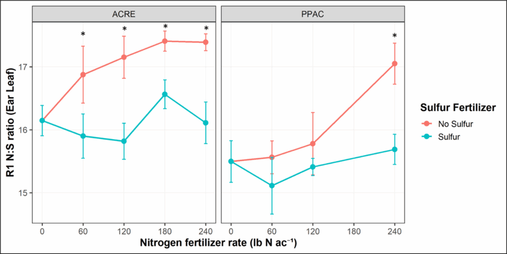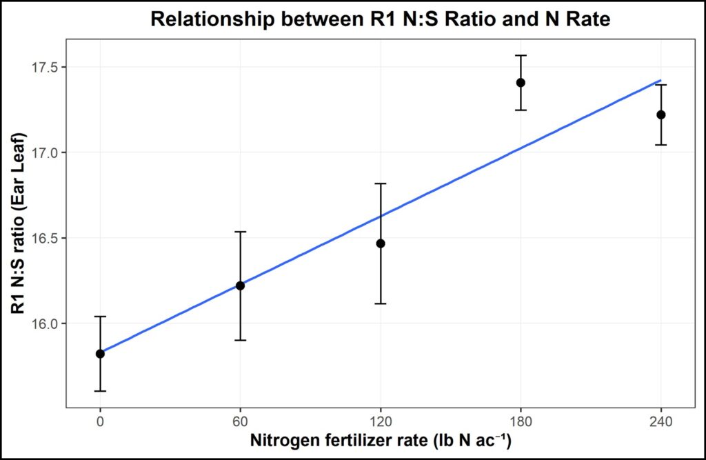 As N fertilizer rates increase, plant tissue N:S ratios also tend to rise (Figure 1), which may exacerbate S deficiency symptoms when S availability is inadequate. Current Purdue University guidelines for diagnosing S deficiency in corn tissue include S concentrations below 0.18 percent and N:S ratios greater than 16:1 in both young vegetative whole-plant samples and R1 ear leaf samples. When tissue S concentrations fall below this threshold and/or N:S ratios exceed 16:1, S deficiency is likely limiting in the plant and S fertilization is likely needed.