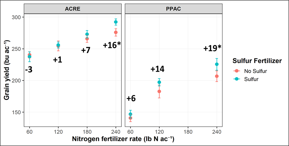 Across both Indiana locations, S fertilization had minimal yield response at low N rates but yield response to S application increased as N rate increased (Figure 2). At the highest N rate (240 pounds N/acre), the inclusion of S fertilizer increased corn yields by approximately 16 to 19 bushels/acre.