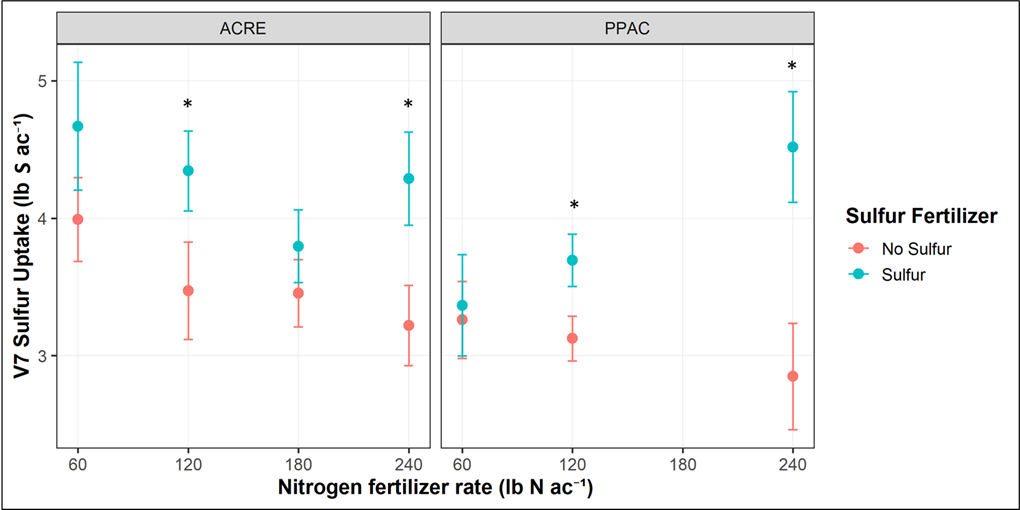 In addition, it was also noted that total S uptake (pounds S/acre) in the V7 whole plant samples decreased as N fertilizer rate increased, and the magnitude of S uptake treatment differences with S fertilizer applied was the greatest at the highest N fertilizer rates applied (Figure 4). These responses further reinforce the concept of how N and S availability and supply interact within the corn plant specific to nutrient uptake and use efficiency.