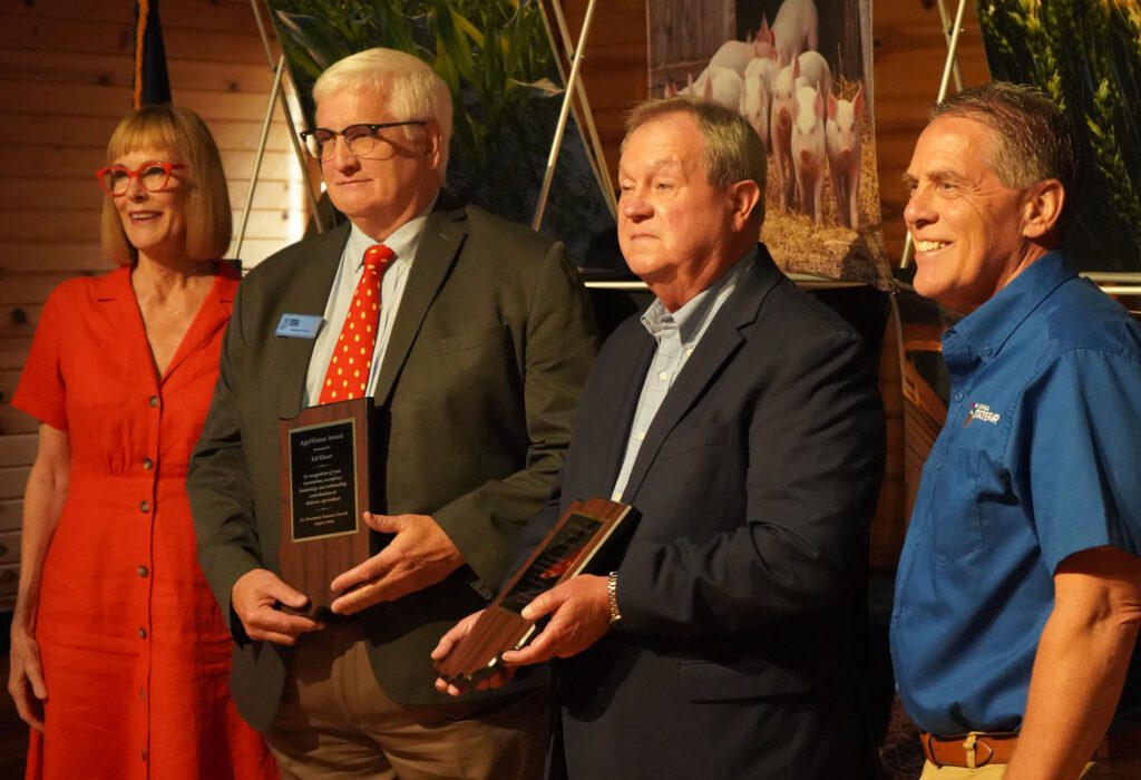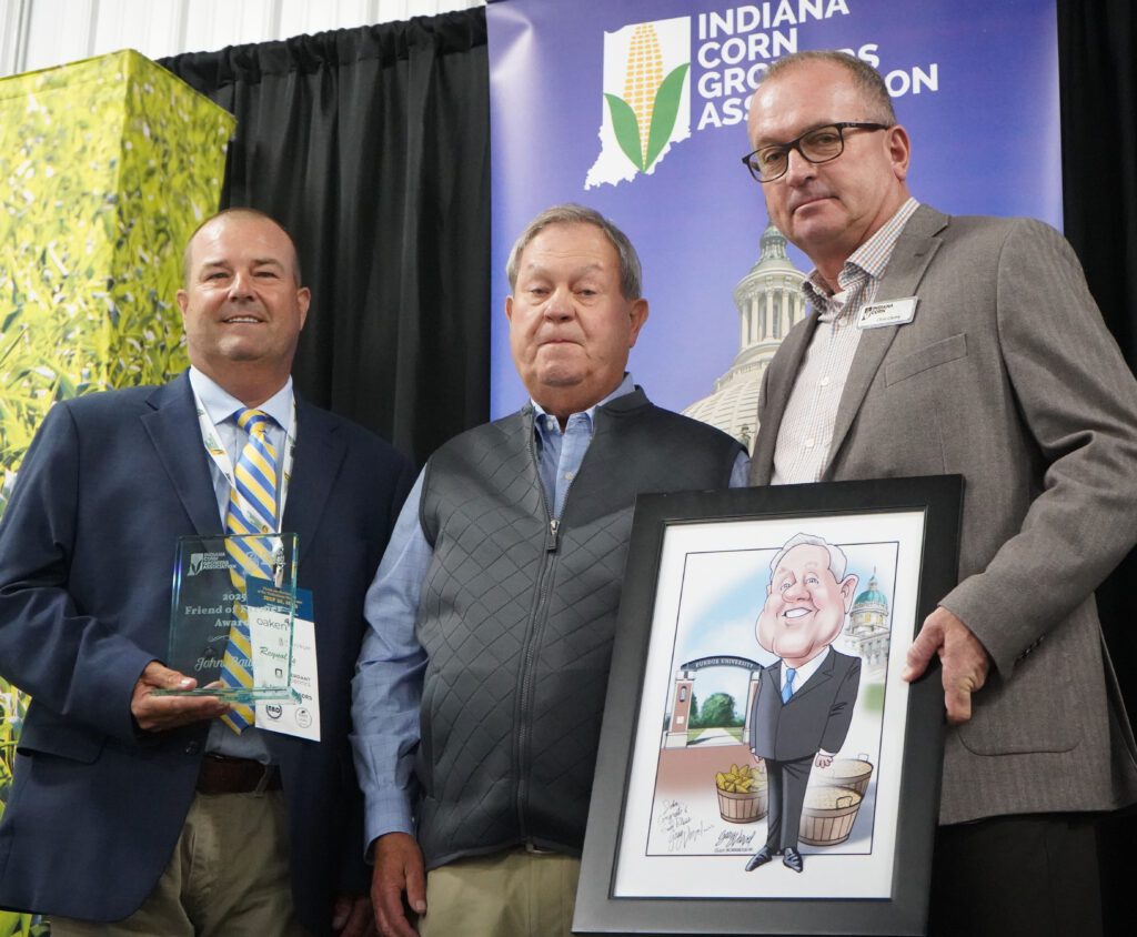 John Baugh, Purdue University’s Director of Agricultural Services and Regulations, was presented with the 2025 Friend of Farmer award at the Indiana Ag Policy Summit on July 30 from Brian Warpup, Chair of the Indiana Soybean Alliance’s Membership and Policy Committee (M&P) and Indiana Corn Growers Association (ICGA) President Chris Cherry.